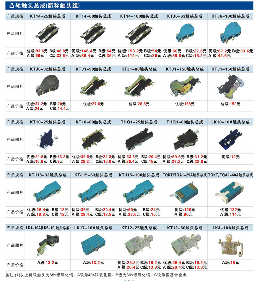 根据触头触点的含银量氧化镉分别为:88%,85%,40%,30%,电压正常情况下,环境污染较轻时,含88%,85%,银氧化镉触头电寿命达10万次以上,含40%、30%银氧化镉触头电寿命可达5万次以上,混合银点,铜基点触头适用于分合次数较少的接触器
