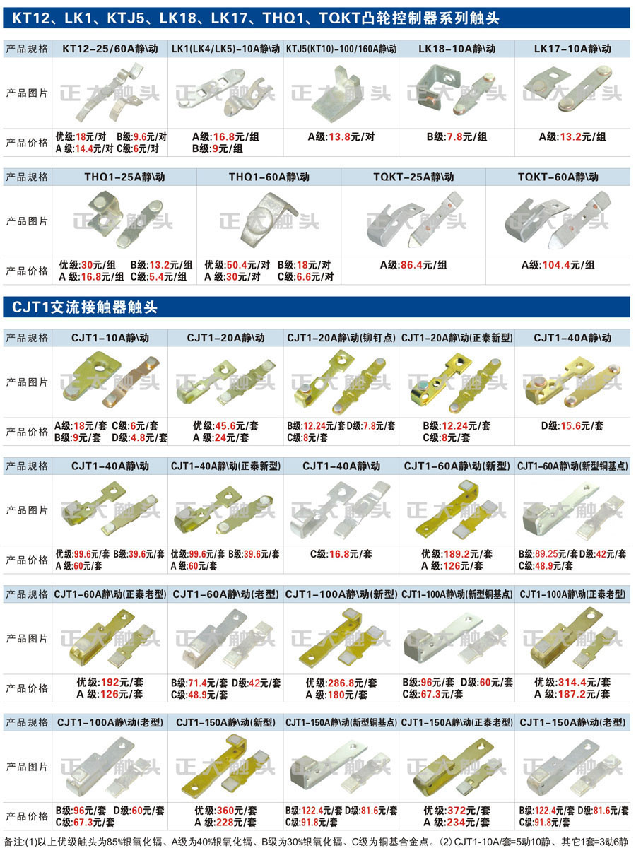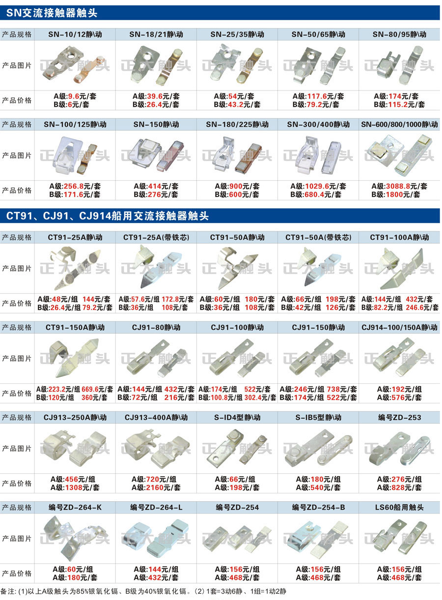 触头元件作为电器开关核心元件,主要用于接触器,继电器,断路器,凸轮控制器,补偿器,行程开关,脚踏开关,辅助开关等。正火电气现生产CJT1,CJX1,CJX2,CJX4,CJX5,CJX8(B系列)CJ20,CJ40,CJ12,CJ15,CJ24,CJ24Y,CJ0,CDC10,CJ91,CT91,CJ913,CJ914,CJ3,CJ8Z交流接触器触头,CZ0,CZ1,CZ3,CZ17,CZ18,CG5直流接触器触头,QJ3,QC83补偿器触头,凸轮控制器,主令触头,KT10,KT12,KT14,KTJ1,KTJ5,KTJ6,KTJ15(QT5),LK1,LK17,LK18,THQ1,TQKT等;断路器触头DW10,DW16,DW15,DW17,DW45,DZ10,DZ20,内燃机触头,矿用触头,叉车,吊车触头,JYN1,JYN2,ZN28,SN10,VS1,梅花触头等。进口ABB系列AF,EH,EK,富士SC系列,日立H系列,施耐德LC1系列,西门子3TF,3TB系列,LG公司(LS产电)GMC系列,三菱机电SN系列。与国内正泰,德力西,天正,人民等,国外ABB,施耐德,西门子,富士,三菱等厂家电气配套。